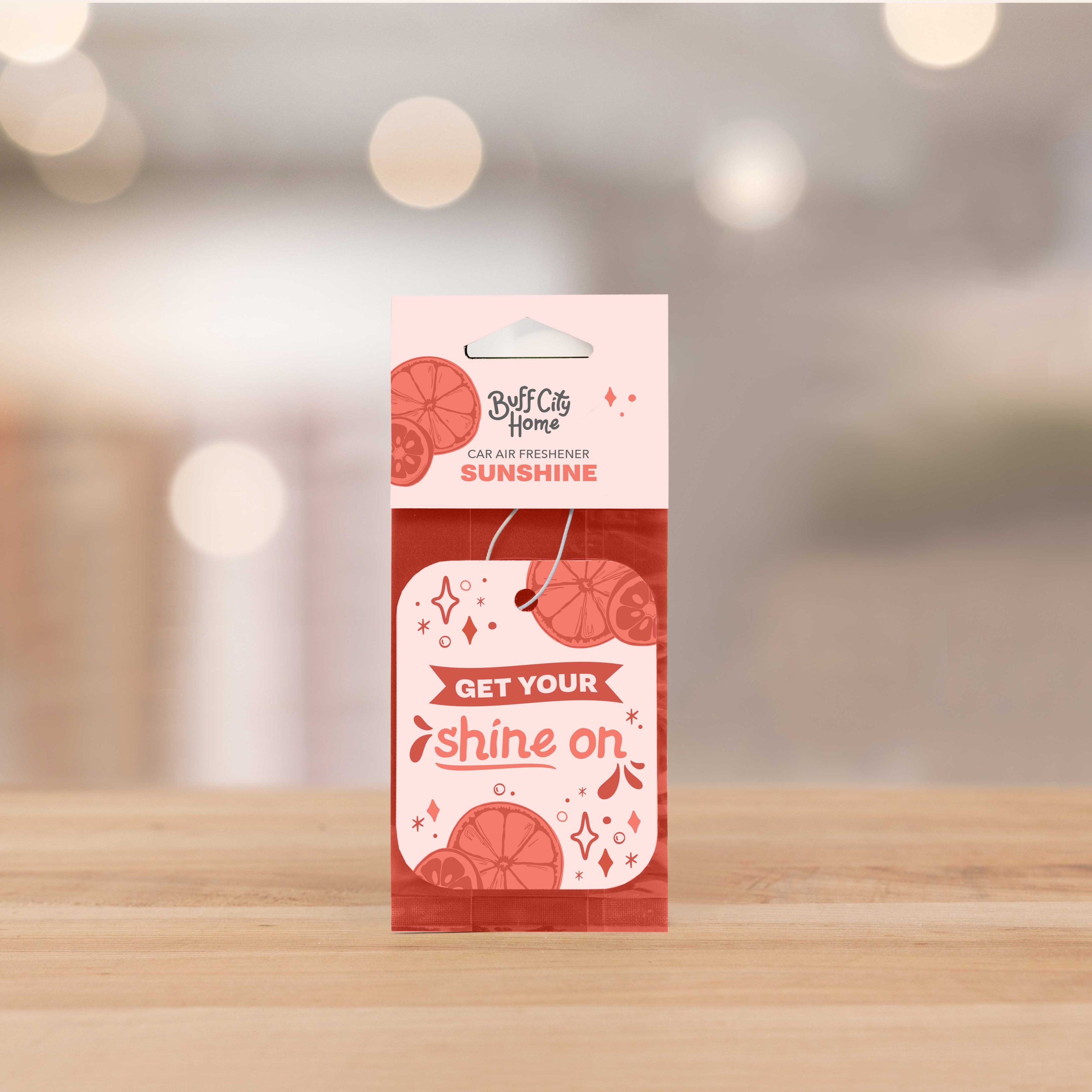 Sunshine Car Air Freshener Perfect for adventure-filled road trips. Notes of vanilla, lavender, cedar will follow you to distant mountains, cedarwood forests, wherever life takes you. A cheerful way to scent your day! Invite happiness into your home with this bright, bubbly blend of sparkling orange, radian